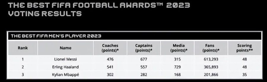 在这四大评选人的投票来看,梅西在国家队队长和球迷中的票数非常高,全部占优,在教练投票中他落后于哈兰德,但分数相差不大,但是在媒体记者中,他和哈兰德的差距明显,远远落后于哈兰德的分数。